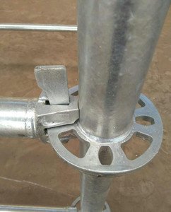 2、圓盤腳手架配件都準(zhǔn)備好后,安裝時只需將橫桿接頭對準(zhǔn)菊花盤位置,然后用手將插銷插入菊花盤孔并穿出接頭底部。