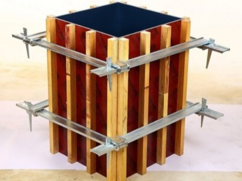方柱扣加固件和傳統(tǒng)的模板加固方式相比,新型方柱扣加固件結(jié)構(gòu)簡單,操作方便,新型方柱扣加固件所需的材料由單片折彎式可調(diào)加固件、緊固斜鐵、輔助支架組成,模塊化構(gòu)件組合施工簡便快捷,效率高。該新型加固方式模板無須打孔,具有足夠的強度和鋼度,脫模后混凝土觀感質(zhì)量好,由于模板無須打孔,從而增加了木模板的周轉(zhuǎn)次數(shù)。
