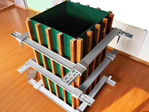 4.額外加固:對(duì)于2.4米以上的覆膜模板,接口部位需要加裝一套方柱扣進(jìn)行額外加固。確保方柱扣水平地覆蓋接口部位,并確保接口方位在加固件的中心。
