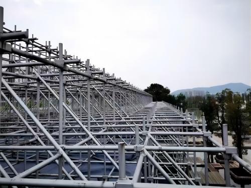 (2)適應(yīng)性強(qiáng) 構(gòu)筑各種形式的腳手架、模板和其它支撐架; 搭設(shè)坡道、工棚、看臺及其它臨時(shí)構(gòu)筑物,作其它種腳手架的輔助,加強(qiáng)桿件。